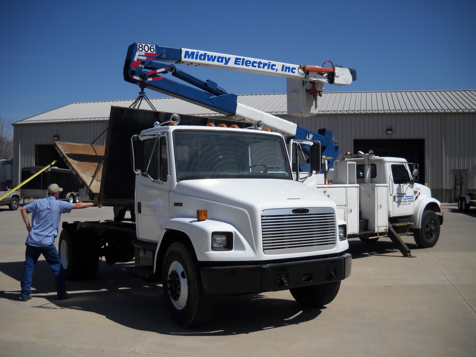 What a beautiful day this turned out to be and when the weather is nice my husband loves to work on something! Anything that involves his play toys (2 of them pictured here) then he is a happy camper. He has always said "If you have to borrow or rent something more than a few times you should own it". He wanted another bigger truck to haul his machines (Mini Excavator, Bobcat, trencher, etc.) so that he doesn't tear up his daily truck. He bought his newest truck (in the front) at an auction and it was yellow. He did some "horse tradin'" (what us country folks call trading out work) and scored himself a paint job on this beauty. He then drove to South Dakota to pick up this bed.... and he says I am crazy for driving a long distance for a "good deal"! We used our bucket truck to place the bed on the truck and just need to "bolt her on"! His little "project" is coming together nicely and he still has a big ol' smile on his face.... he loves that little truck....
